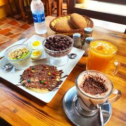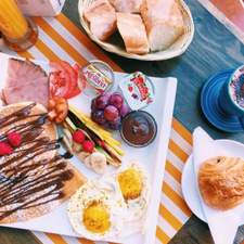 Savourez un petit-déjeuner gourmand avec nos crêpes et pancakes au choix de topping, 2 tartinades délicieuses, jus d'orange frais, boisson chaude, bouteille d'eau et pain frais. Un vrai festin matinal
