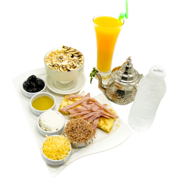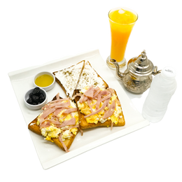 Ce petit déjeuner est composée d'œufs au choix, msemen, méloui, harcha, batbout fromage, miel, olives noires, jus d'orange, boisson chaude, eau 33cl, et pain.