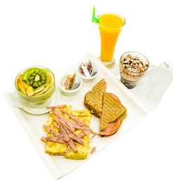 Un petit déjeuner consistant comprenant 2 tartines de pain avec œufs brouillés et jambon de dinde, garnies de tomates et d'olives noires, jus d'orange frais, une boisson chaude,bouteille d'eau de 33 cl.
