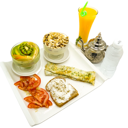 Un petit déjeuner complet avec œufs au choix, olives noires, boisson chaude au choix, jus d'orange pressé et bouteille d'eau. Équilibré, délicieux et énergisant pour bien commencer la journée.