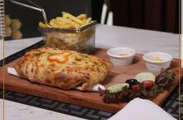 Sauce tomate, fromage mozzarella, poulet, champignons, poivron olive noire, origan