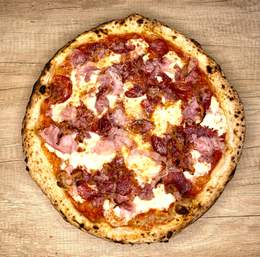 Sos de roșii San Marzano,mozzarella fior di latte, salsiccia, salame napoletan, prosciutto cotto, pancetta rutolata, grana padano, ulei de măsline extra vergine. 550g