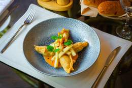 Green mix, pepper, cherry, champignon, mozzarella, nuts, chicken, «Lyonnaise» sauce
