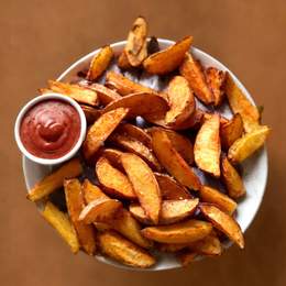 Cartofi făcuți la cuptor făra ulei ( nu sunt pregătiți în friteuza) - 150g și sos la alegere