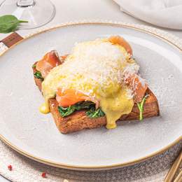 Pan Brioche, ou poșat, unt, spanac, parmezan, somon slab sărat, sos olandez. Conține alergeni: lapte, ouă, gluten, pește. - 330g