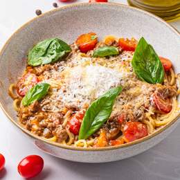 Spaghetti, tocătură de vită, tocătură de porc, morcov, ceapă, ardei gras, vânătă, vin roșu, parmezan, roșii cherry, condimente. Conține alergeni: gluten, lapte, dioxid de sulf.