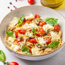 Spaghetti, piept de pui, parmezan, mozzarella, roșii cherry, fulgi de ardei iute, usturoi, pătrunjel, busuioc. Conține alergeni: gluten, lapte.