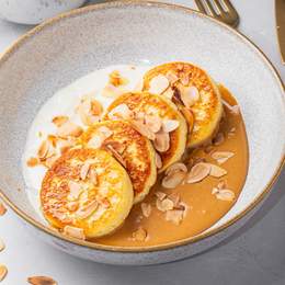 Brânzoaice, făină de orez, fulgi de migdale, unt, sos iaurt, sos cu lapte condensat fiert.