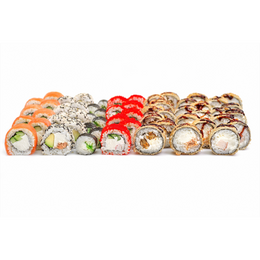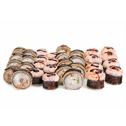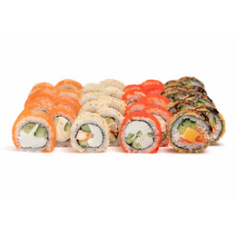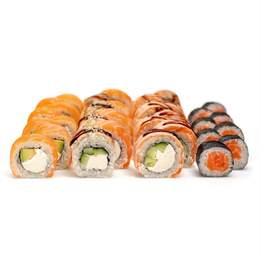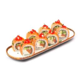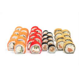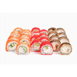 Orez, somon, cremă de brânză, castraveți, avocado, oțet de orez, zahăr, alge nori, sare de uz alimentar, alge kombu, ceapă, masago roșie