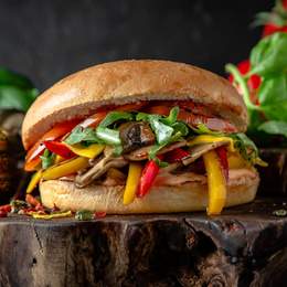 Ciuperci champignon, broccoli, ardei gras, ceapă roșie, sos vegetarian Tonkatsu, soia, zahăr, servit cu ghimbir - 280g