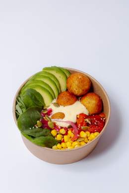Chiftelutele din naut cu mijloc verde de spanac si coriandru si o crusta crocanta de susan care te cuceresc cu mirosul sau. Le servim cu crema de ardei copt, iaurt vegan, rosii cherry si varza kimchi - 240g