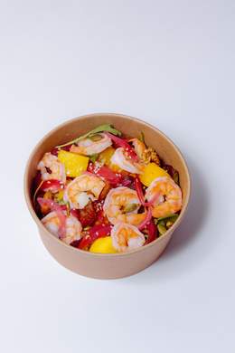 E o salata fresh si exotica, cu creveti proteici, mango parfumat si quinoa pufoasa. Ceapa marinata condimenteaza placut salata, iar mixul de salata, rosiile uscate si cartoful dulce sunt imbracate intr-un sos vibrant de kalamansi.