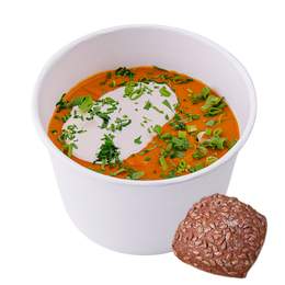 O cer oaspetii care isi doresc o supa de post, servita cu branza tofu pentru un boost de proteina vegetala. Contine legume si linte, iar laptele de cocos ii da un gust catifelat. - 310g