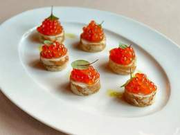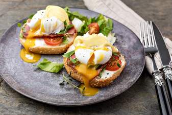 Ouă, creveți, somon, bacon, brânză, spanac, roșii. 190 g