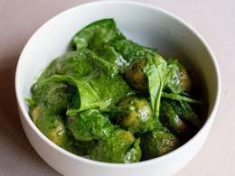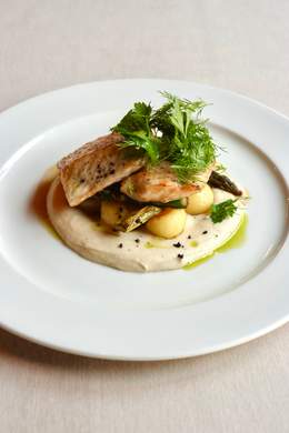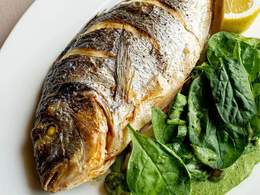 Dorada, condimente, ulei de măsline, garnitură - cartofi prăjiți, spanac, sos pesto, frișcă, nucșoară, lămâie. 620 g