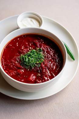 Cartofi, sfeclă roșie, verdeață, carne de vită, ceapă, servit cu ardei iute și smântână. 380 g