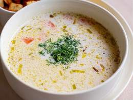 Bulion de pește, frișcă, praz, morcovi, cartofi, somon, servit cu crutoane și lămâie 350g