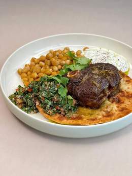 Pâine plată, vițel, roșii, fasole, porumb, ardei iute, cheddar, condimente picante, servită cu ajika și sos tszadziki. 450 g
