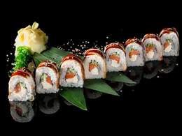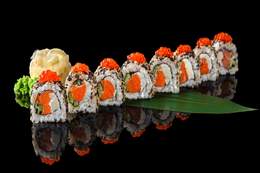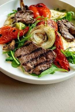 File de vițel, salată mixtă, sos de susan, dovlecei, ardei grași, ceapă, ciuperci, roșii. 350 g