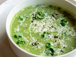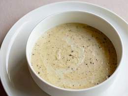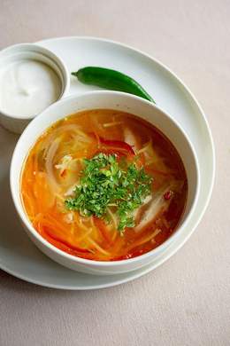 Ceapă, morcovi, țelină, smântână, spanac, sos pesto, sos de brânză, servit cu crutoane. File de pui, creveți, somon pot fi comandate suplimentar. 350 g