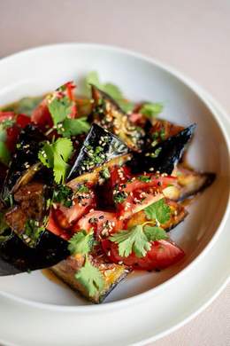 Vinete prăjite, roșii, coriandru, sos picant, susan. 350 g