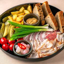 2 tipuri de slănină, castraveți murați, patisson, pâine prăjită, roșii murate, ceapă verde, muștar. 336 g