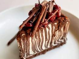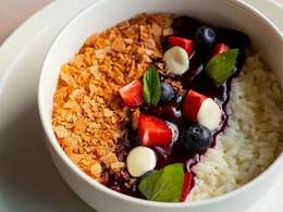 Orez Arborio, frișcă, lapte, ciocolată albă, unt, sos de zmeură, fructe de pădure proaspete, fărâmituri de vafe 320g