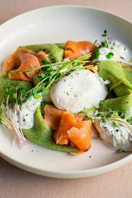 Clătite cu spanac, somon ușor sărat și ou poșat