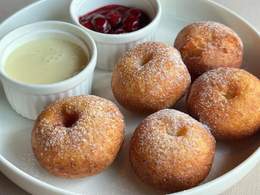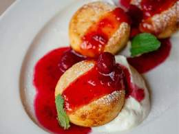 Caș, făină, ou, unt, servit cu lapte condensat și sos de vișine. 275 g