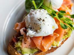 Pâine, cremă de brânză, avocado, somon, 2 ouă poșate.300 g