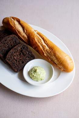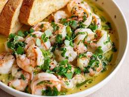 Crevete călite în vin alb, chili și felii crocande de ciabatta