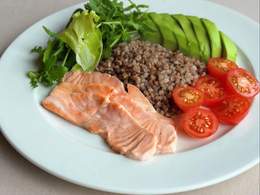 Hrișcă, mix de salat, cherry, somon la cuptor, avocado. 400g