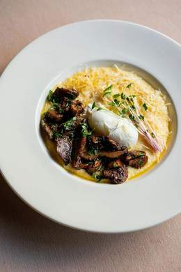 Făină de porumb, smântână, unt, parmezan, ou poșat, ciuperci prăjite, pastă de trufe. 320 g