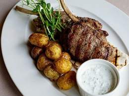 Rack de vițel la grătar, pâine pita, sos tszaziki, cartofi.450 g