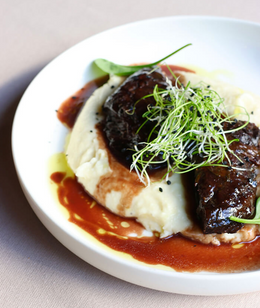 Ingrediente: obraji de vițel, vin roșu, ierburi aromatice, usturoi, condimente. Se servesc cu piure de cartofi, vlăstari de ceapă verde și sos de vin roșu.