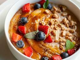 Ovăz, lapte, scorțișoară, măr, banană, fructe de pădure proaspete, caramel sărat, granola, unt. 470 g