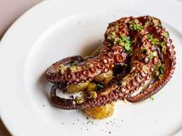 Octopus, capere, usturoi, pătrunjel, suc de lămâie, ulei de măsline. Garnitură cu caracatiță: cartofi prăjiți cu rozmarin, sos de brânză, pătrunjel. 300 g