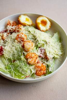 Creveți, sos caesar, ou poșat, salată iceberg, crutoane, roșii cherry. 350 g