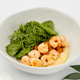 File de pui sous vide, sos miso, susan, castravete, avocado, spanac, boabe edamame, ou de prepeliță, sos de mere, piure de bergamotă, piure de citrice și morcovi, dressing de citrice, ceapă verde, sare, coajă rasă de portocală - 340g