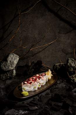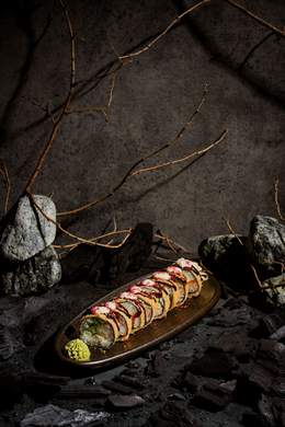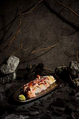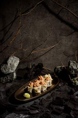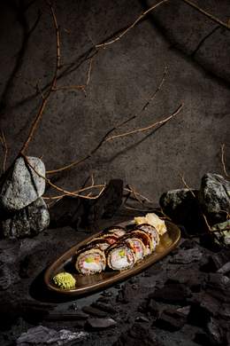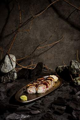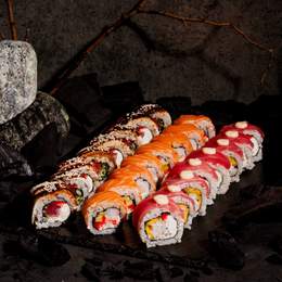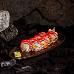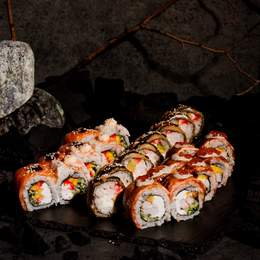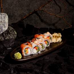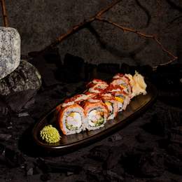 Orez, nori, cremă de brânză, creveți în aluat, avocado, somon flambat, sos spicy, icre tobiko, sos unagi, susan, ghimbir, wasabi, sos de soia -290/20/10/40