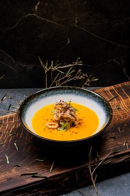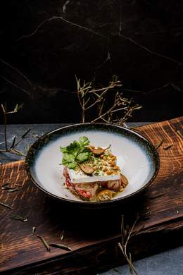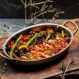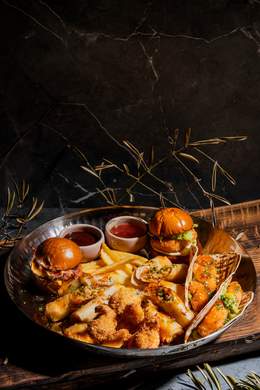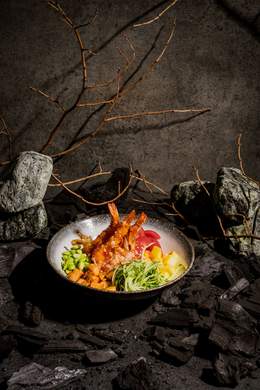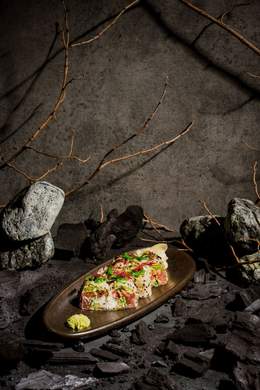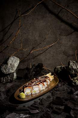 Orez, nori, cremă de brânză, creveți tempura, castravete, avocado, aluat crocant, aioli cu trufe, sos spicy, icre tobiko, sos unagi, ghimbir, wasabi, sos de soia -340/20/10/40