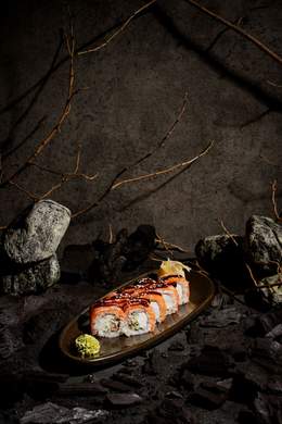 Orez, nori, cremă de brânză, anghilă, castravete, somon, sos unagi, susan, ghimbir, wasabi, sos de soia -280/20/10/40