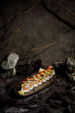Nori, cremă de brânză, somon, castravete, avocado, tartar de anghilă, ghimbir, wasabi, sos de soia -200/20/10/40