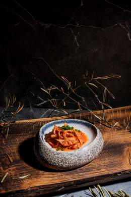 Rigatoni alla Puttanesca cu creveți și sos de roșii