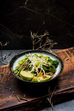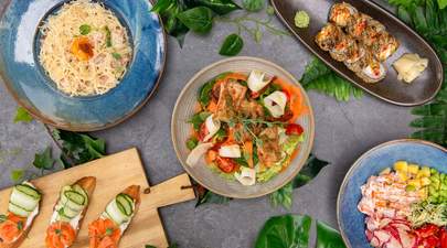 Orez, nori, ardei dulce, castravete, avocado, salată iceberg, salată chuka, salsa de mango și roșii, susan, sos unagi, ghimbir, wasabi, sos de soia -290/20/10/40