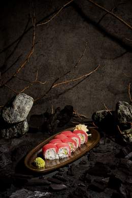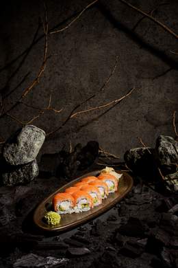 Orez, nori, cremă de brânză, somon, icre tobiko, avocado, sos unagi, ghimbir, wasabi, sos de soia -300/20/10/40
