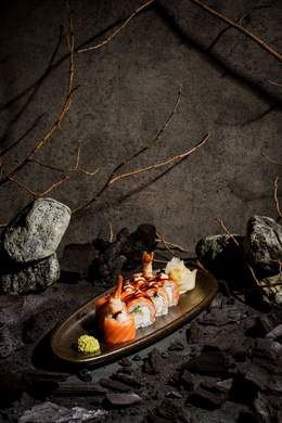 Orez, somon, sos de soia, aioli cu trufe, icre roșii, ghimbir, wasabi -43/10/5/20