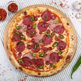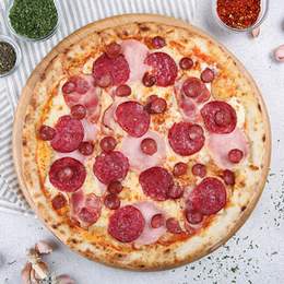 Sos Pomodori pelati, mozzarella, bacon, salam, cabanos, ardei iute, chilly. 560g*Acest produs conține alergeni 1,7*Gramajul este indicat pentru forma crudă a produsului