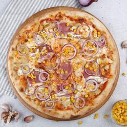 Mozzarella, șuncă, piept de pui, frișcă, porumb. 610g*Acest produs conține alergeni 1,7*Gramajul este indicat pentru forma crudă a produsului.