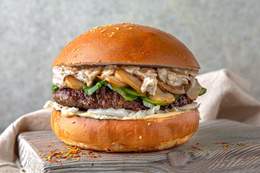 Chiflă Bao sau chiflă Brioche, carne de vită condimentată, ciuperci, salată verde, castraveți proaspeți, ceapă roșie, sos Ranch - 310g
